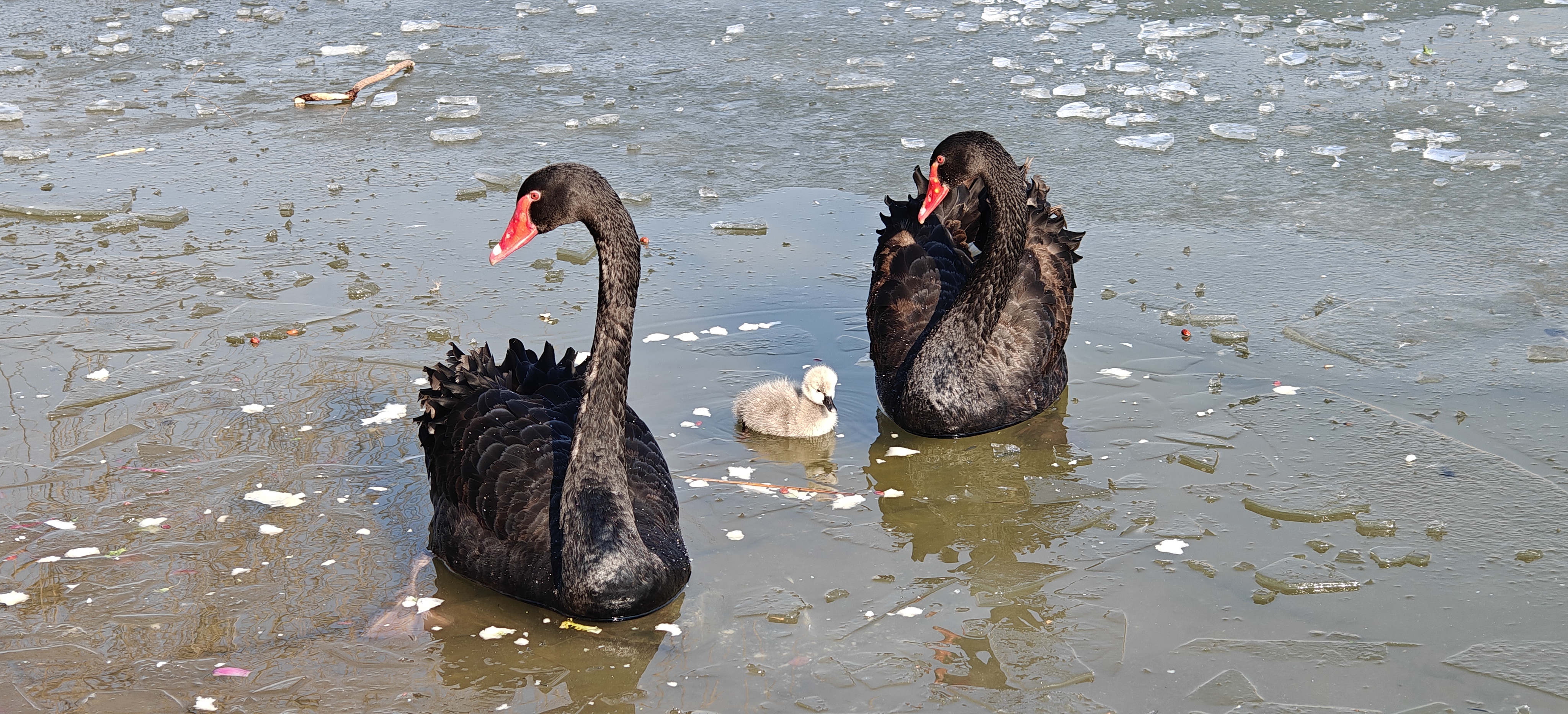 发帖人屈女士告诉封面新闻记者,1月2日,她所在的一个水禽爱好者群里,一位网友发现了这一情况,“说是一对黑天鹅生了一窝小天鹅,有6只,有一只粘在了冰面上”。